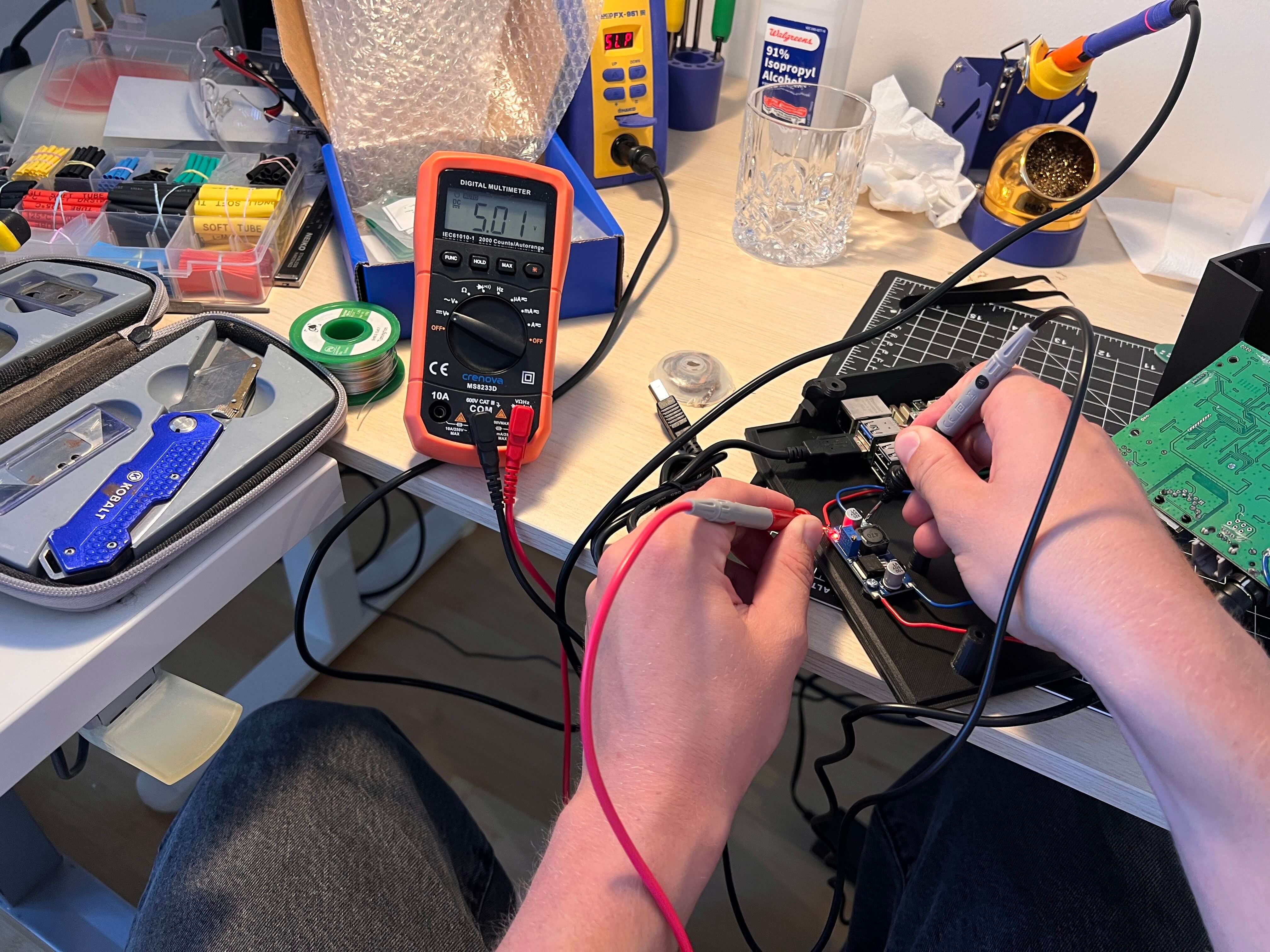 Before continuing with the mainboard mounting, I wired the - IN terminal of the buck converter to the 24V in connector on the printer mainboard and the + IN to the printer power switch(note polarity below), and then used the potentiometer on the buck converter to set the output voltage to 5V.