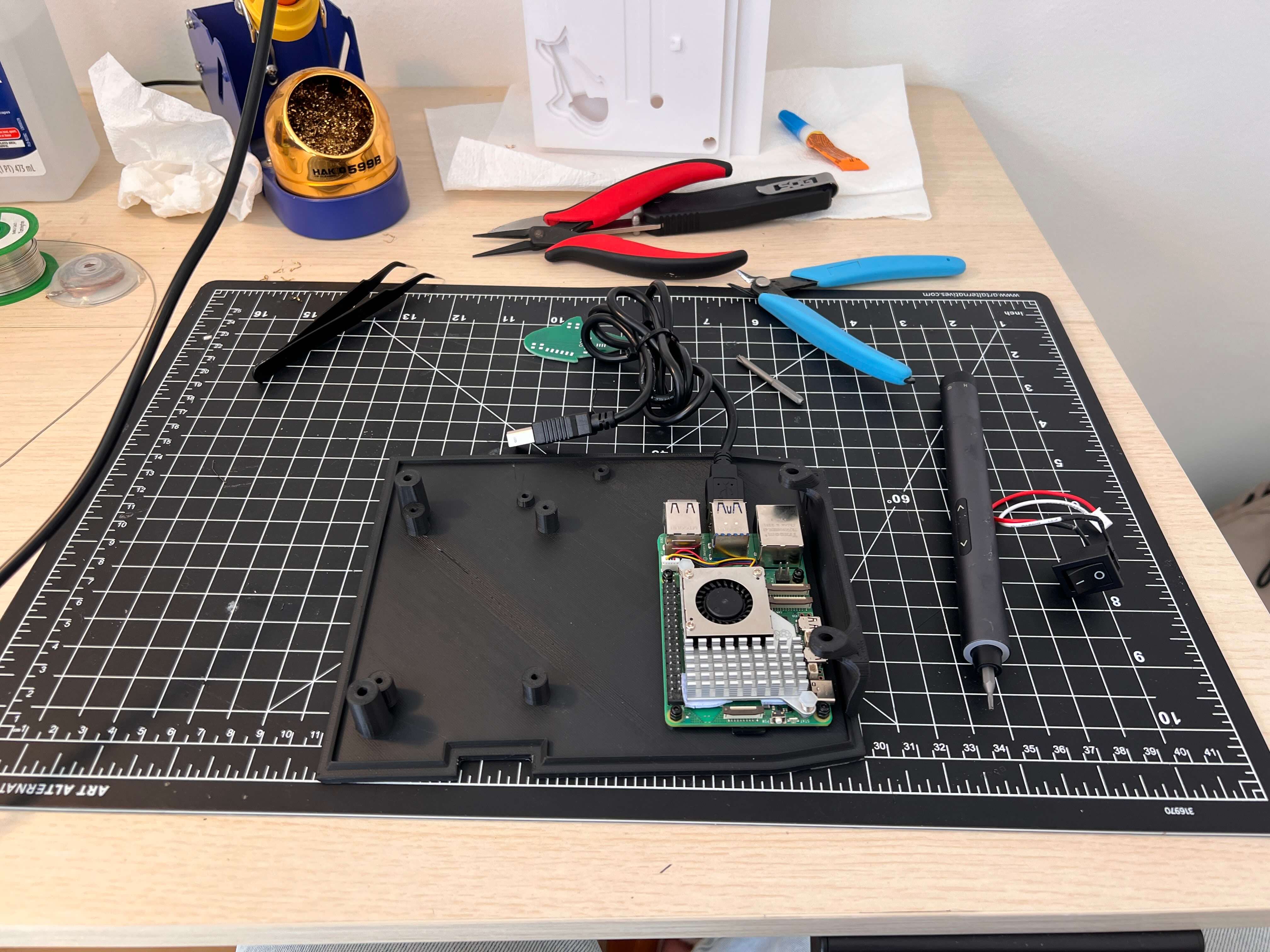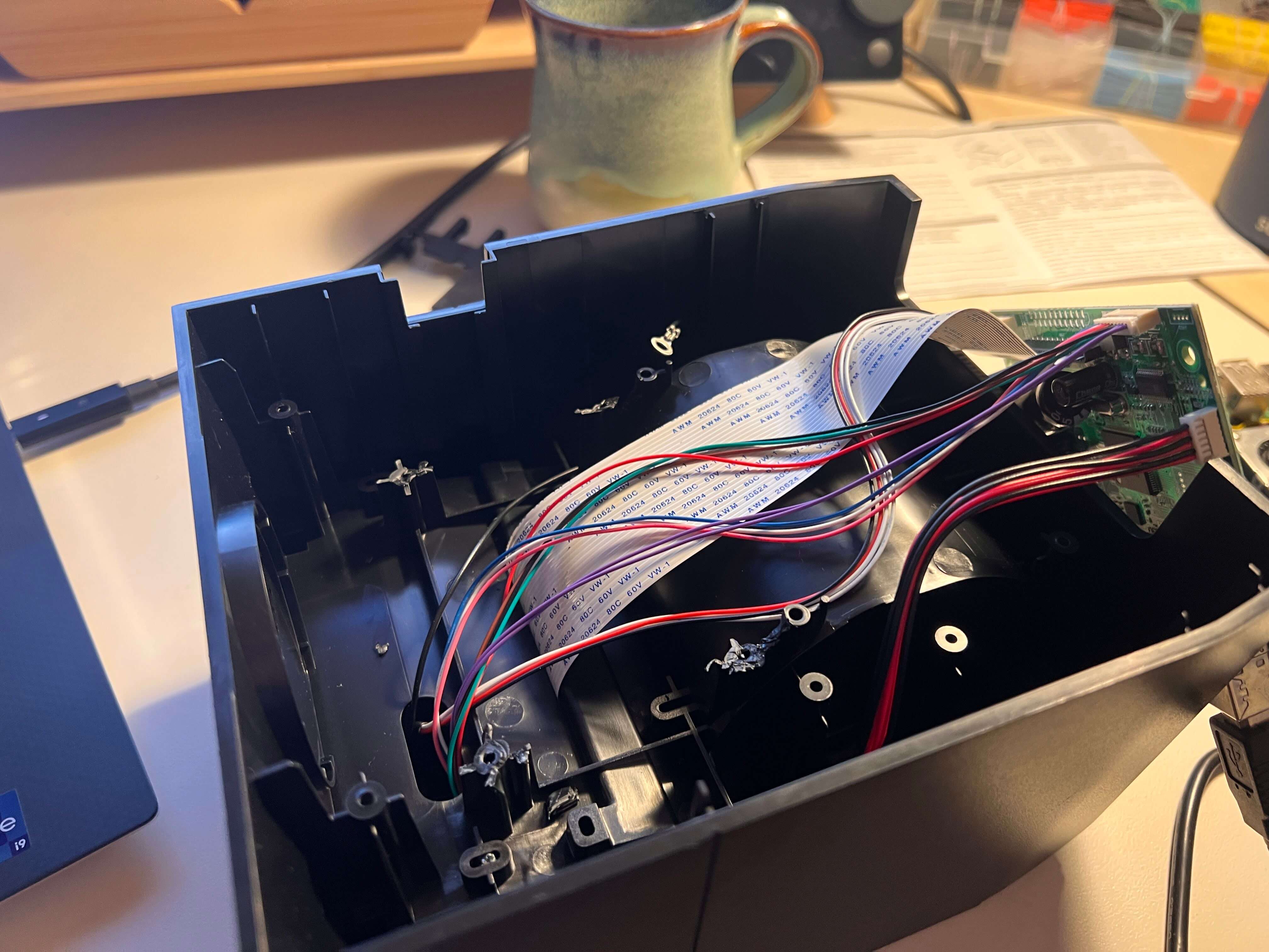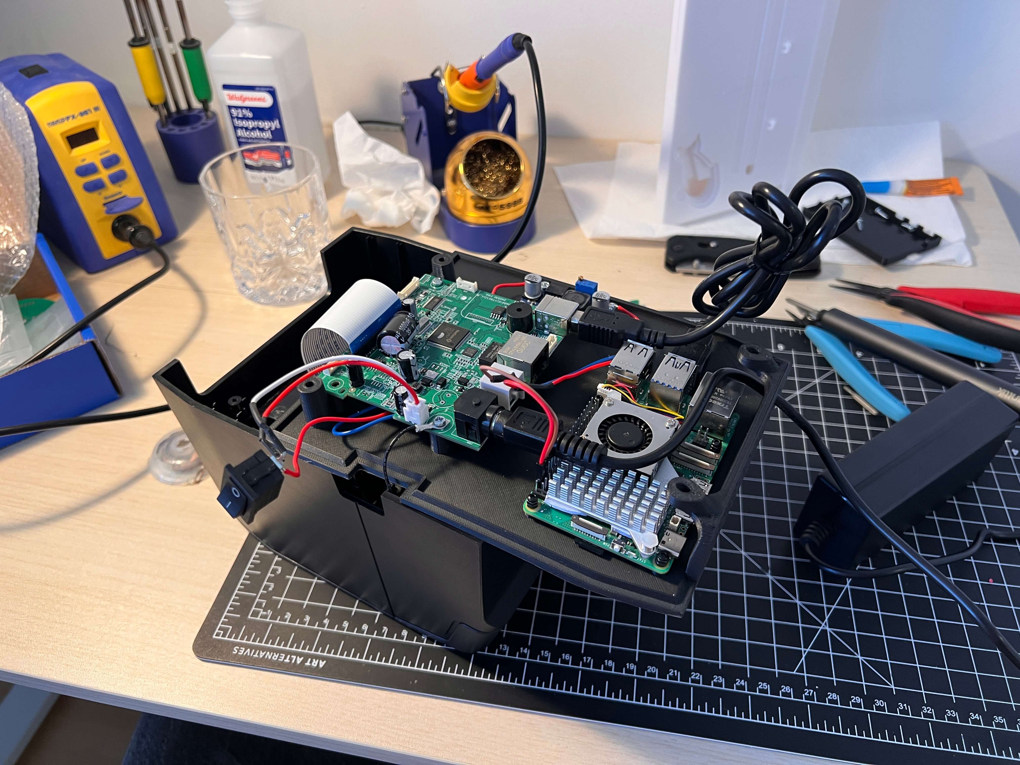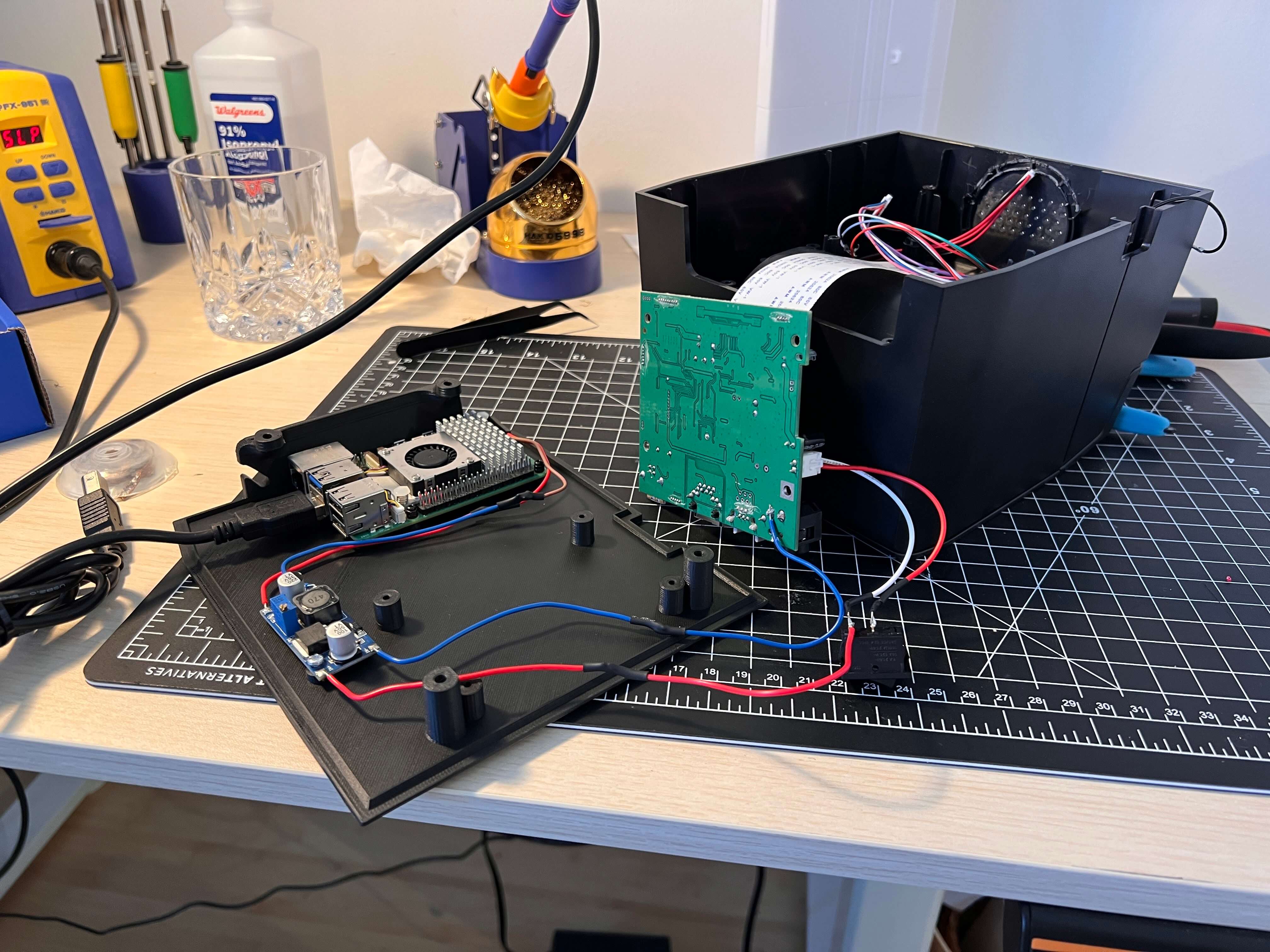 I wired the +/- 5V output lines from the buck converter to the Raspberry Pi’s GPIO, connected the printer mainboard to the Raspberry Pi via USB, and plugged in the printer mainboard’s power (don’t actually attach this to the wall yet, get everything mounted and closed up first) and then mounted the mainboard to the 3D printed baseplate (you’ll need to plug in all the wires before mounting, its a tight fit).