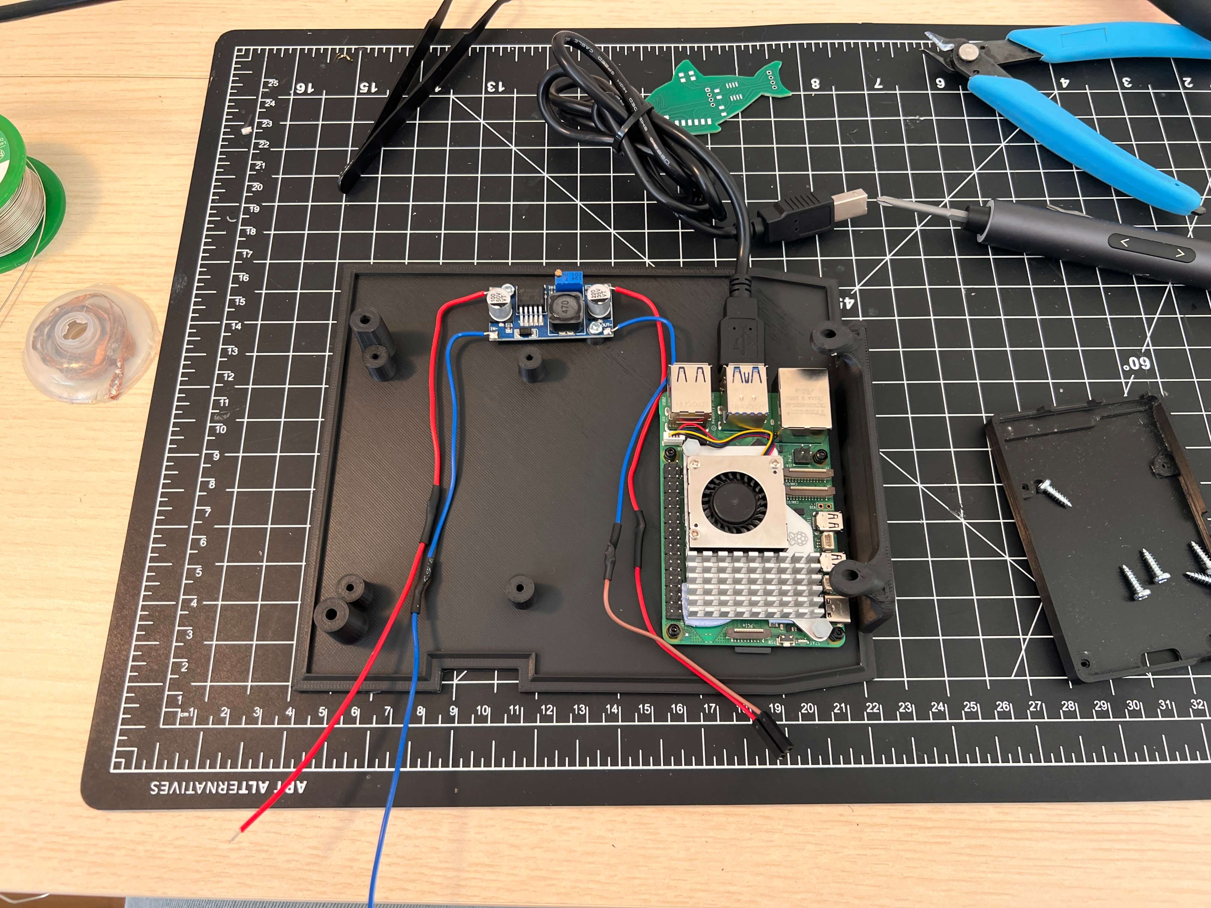Then I started mounting components to the 3D printed baseplate, first the raspberry pi, then the buck converter.