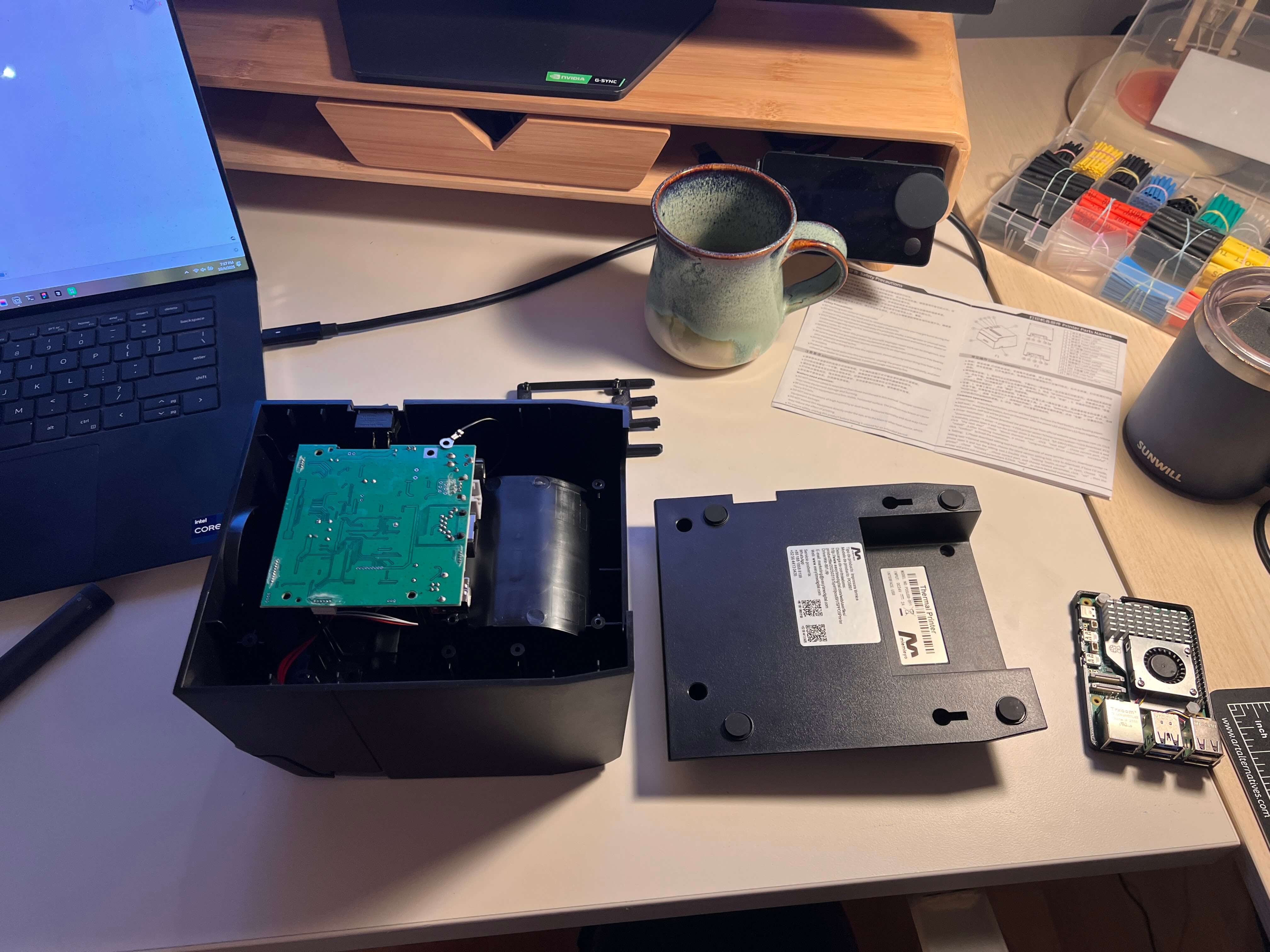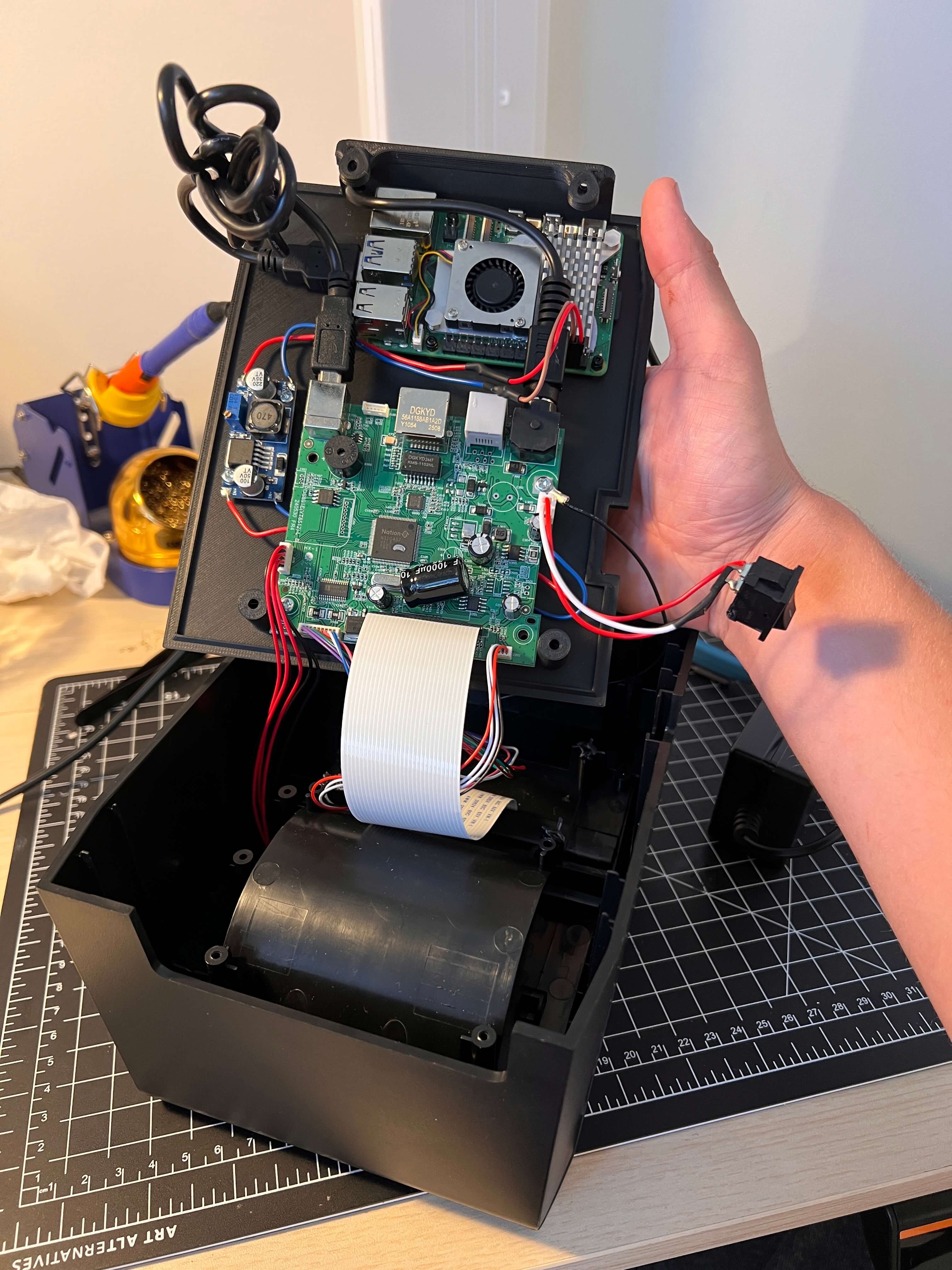 I printed this new base on my Prusa I3 MK3S+, cleaned it up, and then prepared the thermal printer for installation. This primarly involved unmounting and detaching all plugs from the mainboard to prepare to mount it to the new base. Additionally, I used some wire snippers to remove the old mainboard mounts (as pictured below)