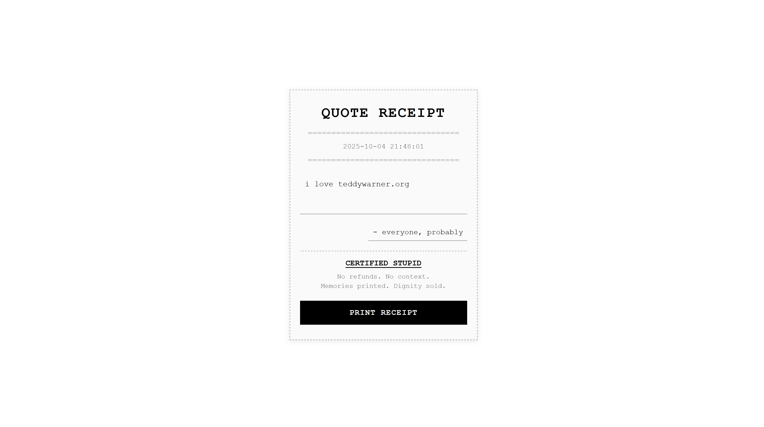 The general premise of this build is pretty easy: people in my apartment say silly / interesting / funny things all the time. Upon hearing one of these silly / interesting / funny things, a user should be able to print said thing with little imposition. As such, we’ll need a locally hosted website, of course - A user will hear a quote, open said local website, and then a “quote receipt” will be generated and printed to memoralize that silly / interesting / funny moment for all of eternity.